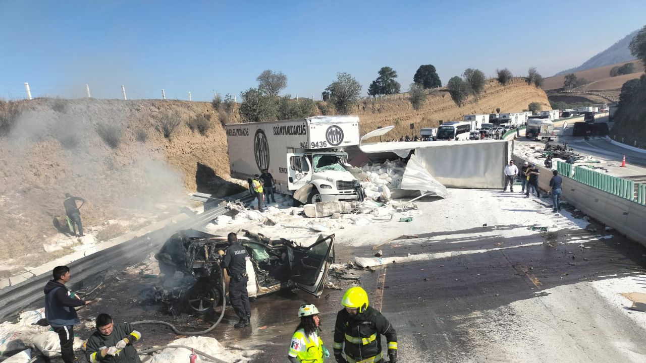 Un aparatoso accidente en la autopista México-Puebla en el Estado de México cobró la vida de una persona y dejó al menos 5 heridos luego del impacto que provocó la volcadura de un tráiler y un automóvil completamente calcinado, en el kilómetro 46, cerca de la localidad de Río Frío,