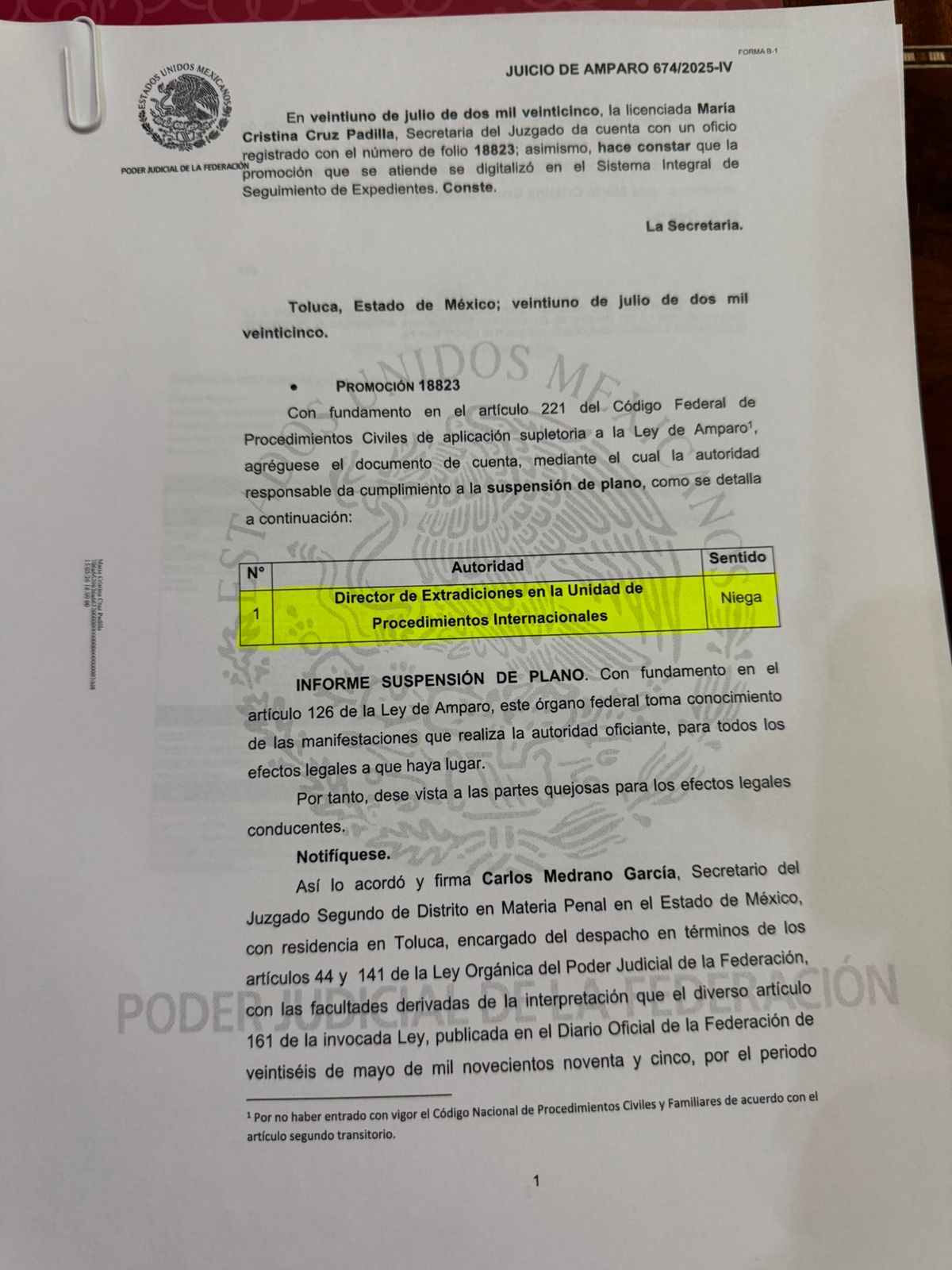 En consecuencia, el secretario en funciones de juez,Carlos a Medrano García determinó negar la suspensión solicitada por el michoacano por no existir materia sobre que aplicarla.