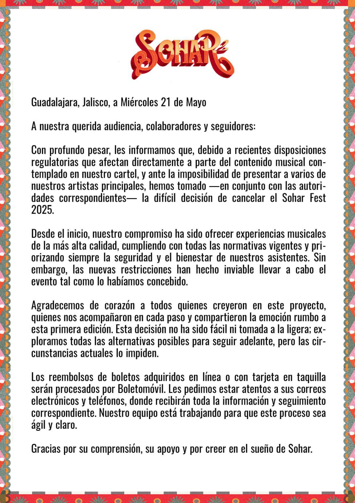 A nuestra querida audiencia, colaboradores y seguidores: Con profundo pesar, les informamos que, debido a recientes disposiciones regulatorias que afectan directamente a parte del contenido musical contemplado en nuestro cartel, y ante la imposibilidad de presentar a varios de nuestros artistas principales, hemos tomado —en conjunto con las autoridades correspondientes- la difícil decisión de cancelar el Sohar Fest 2025.