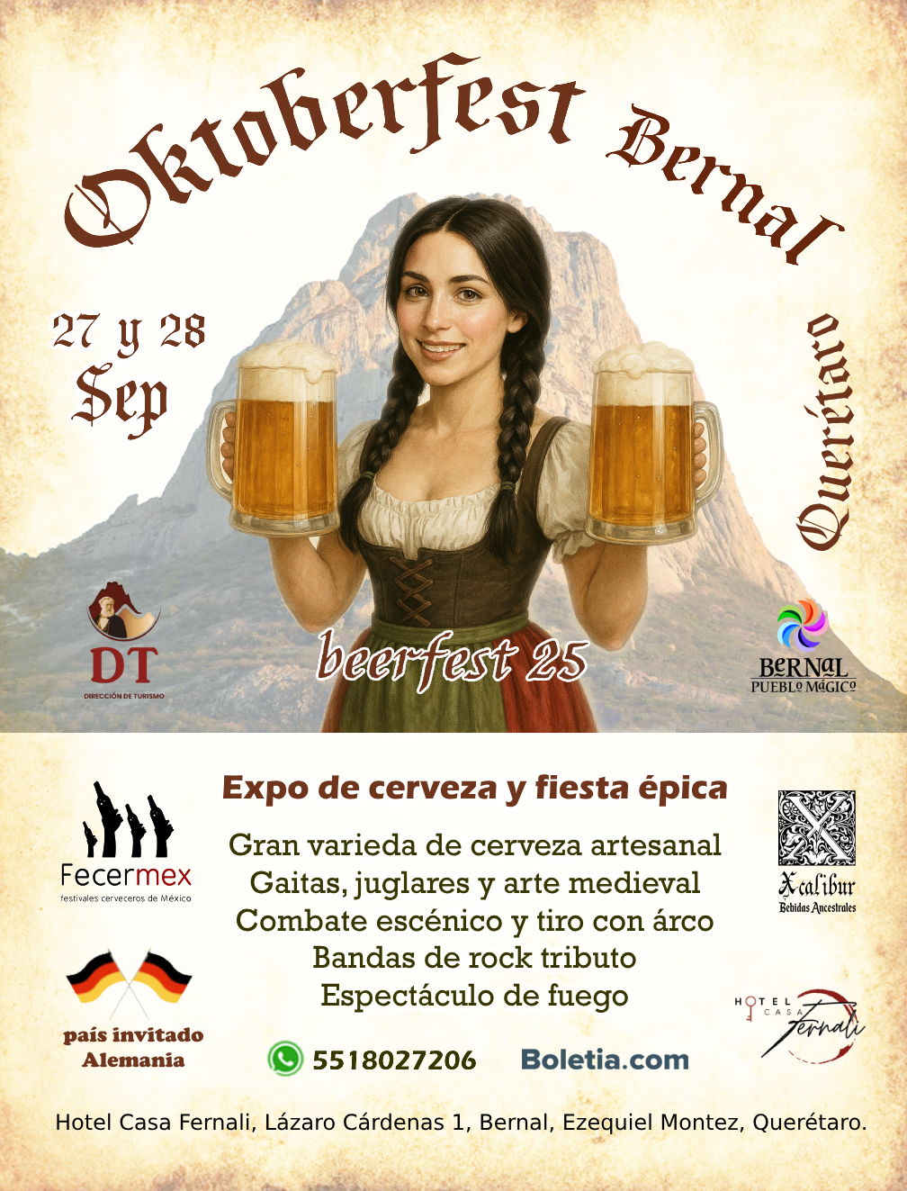 En un país donde el turismo, la cultura y la gastronomía viven una constante reinvención, el Oktoberfest Bernal se erige como un faro que guía hacia experiencias memorables. La fiesta cervecera más esperada del otoño llega para marcar historia en Querétaro, invitando a brindar con pasión, a explorar el sabor y a vivir la música en una de las locaciones más hermosas del estado. Bernal, con su aire místico y su sabor a leyenda, se prepara para vibrar como nunca. Y es FECERMEX quien, una vez más, teje el puente entre las tradiciones más queridas del viejo continente y la pasión incansable de los paladares mexicanos. Porque en cada cerveza hay una historia, y en cada brindis, un motivo para seguir celebrando la vida. El Oktoberfest Bernal 2025 no es un evento más: es un destino, un viaje, un recuerdo que apenas está por escribirse, con espuma, fuego, música y corazón.