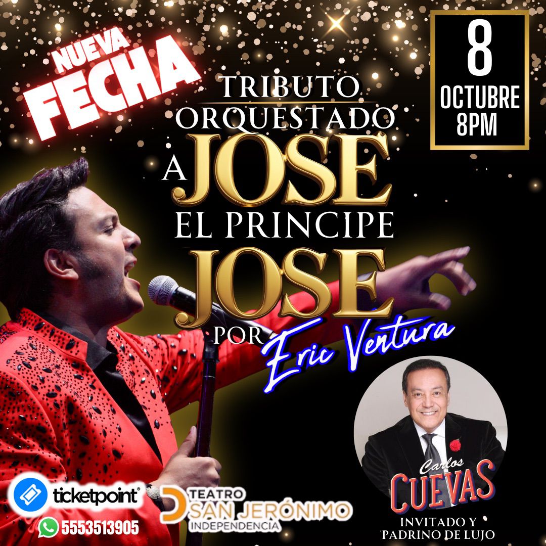 Eric Ventura en concierto: homenaje a José José, con el maestro Carlos Cuevas como padrino. 8 de octubre, 20:00 horas. Teatro San Jerónimo Independencia. Boletos disponibles en TicketPoint.