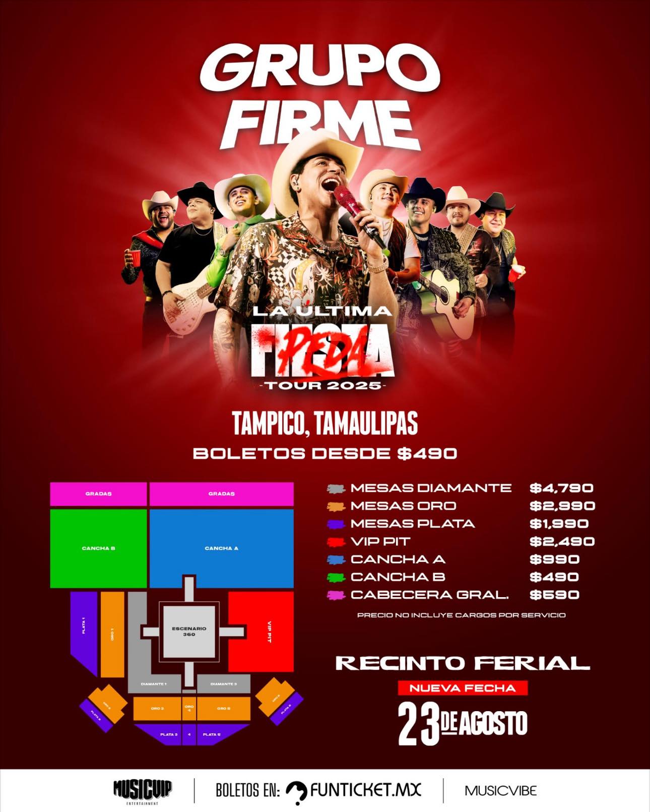 Grupo Firme se presentan el próximo Sábado 23 de agosto en el Recinto Ferial de Tampico, Tamaulipas a partir de las nueve de la noche. Boletos a la venta en el Sistema FunTicket con precios que van desde los 490 hasta los 4,900 pesos.