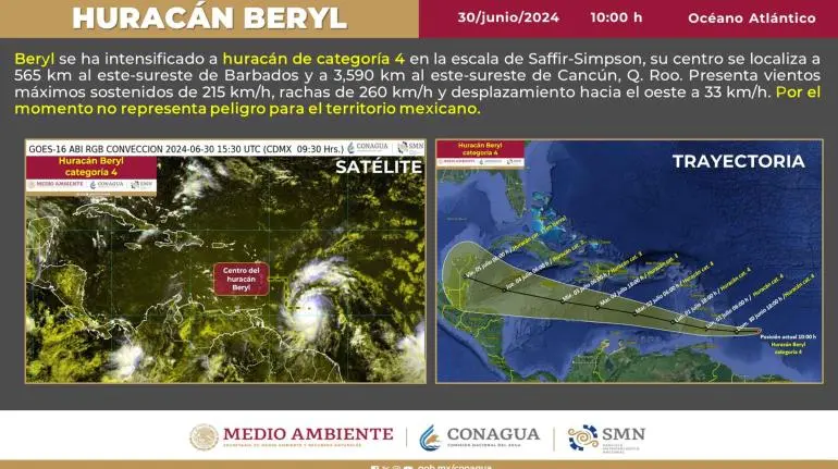 Por su parte, el Servicio Meteorológico Nacional (SMN) mencionó que se prevé que desde hoy y hasta el próximo 2 de julio, “Beryl” mantenga su categoría 4 y que perdería fuerza el 3 de julio.
