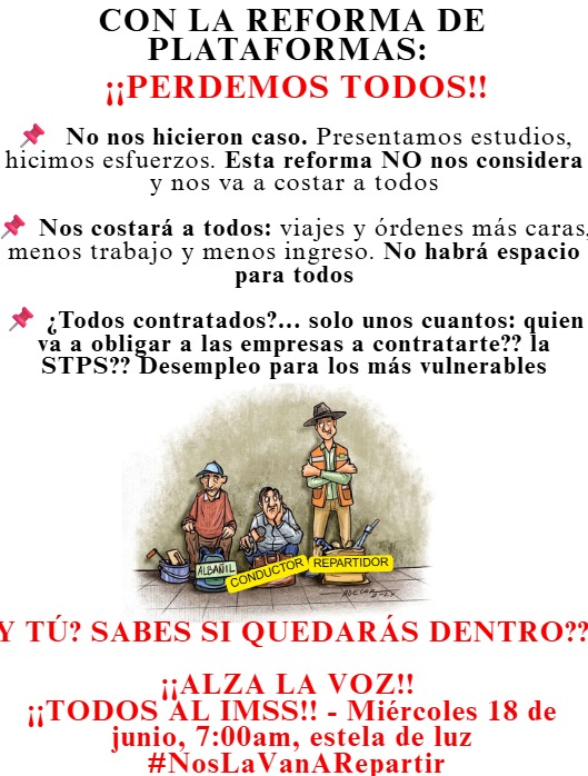 Lo hemos dicho y lo hemos repetido, de una y mil formas, hicimos estudios que nos pidió la STPS para definir el INGRESO NETO, y no se nos ha tomado en cuenta para esta definición. Tampoco existe claridad del impacto por parte de las plataformas, lo que nos indica que tampoco saben qué va a pasar con la reforma..