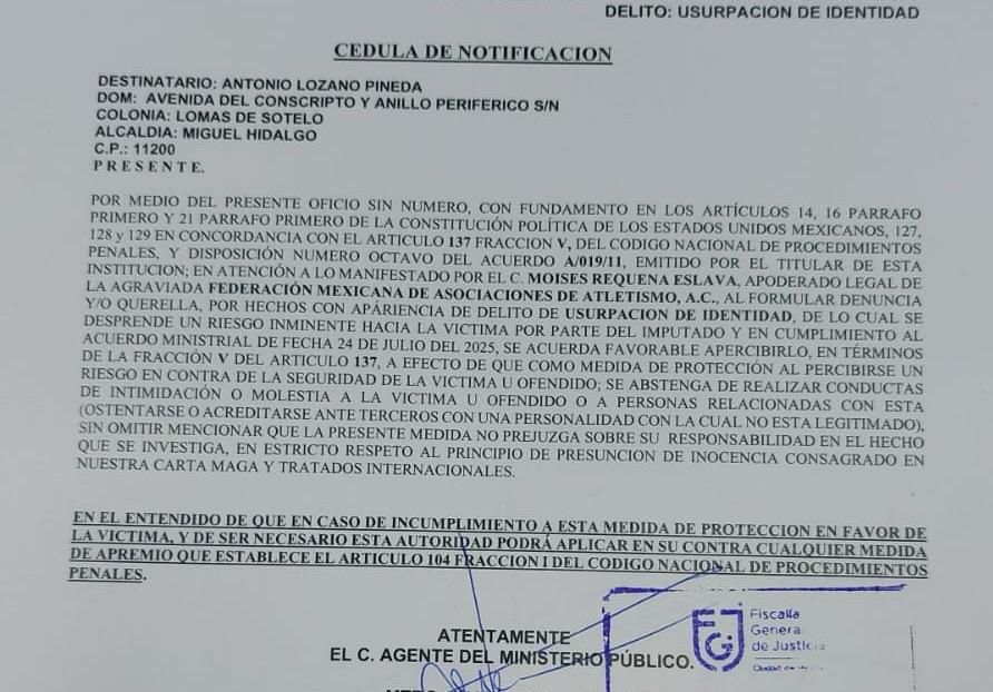 CIUDAD DE MÉXICO, julio 24 (XPFM). -La Fiscalía General de Justicia de la Ciudad de México (FGJCDMX), giró medidas precautorias contra Antonio Lozano Pineda y todo su Consejo Directivo, para no ostentarse, ni organizar eventos a nombre de la Federación Mexicana de Asociaciones de Atletismo (FMAA).